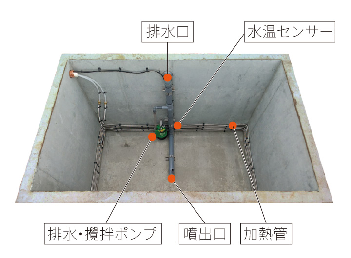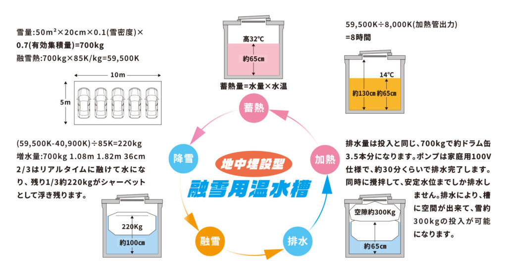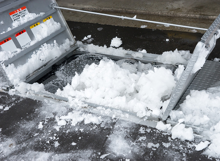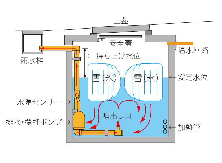 雪を入れると貯水に浸かってゆっくり溶けます。冷えた水はボイラーで温められ、増えた水はポンプで排水されます。排水しても貯水は減らない仕組みです。